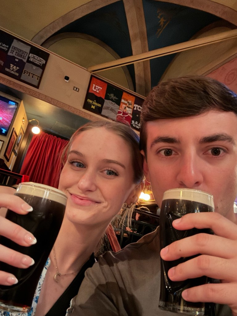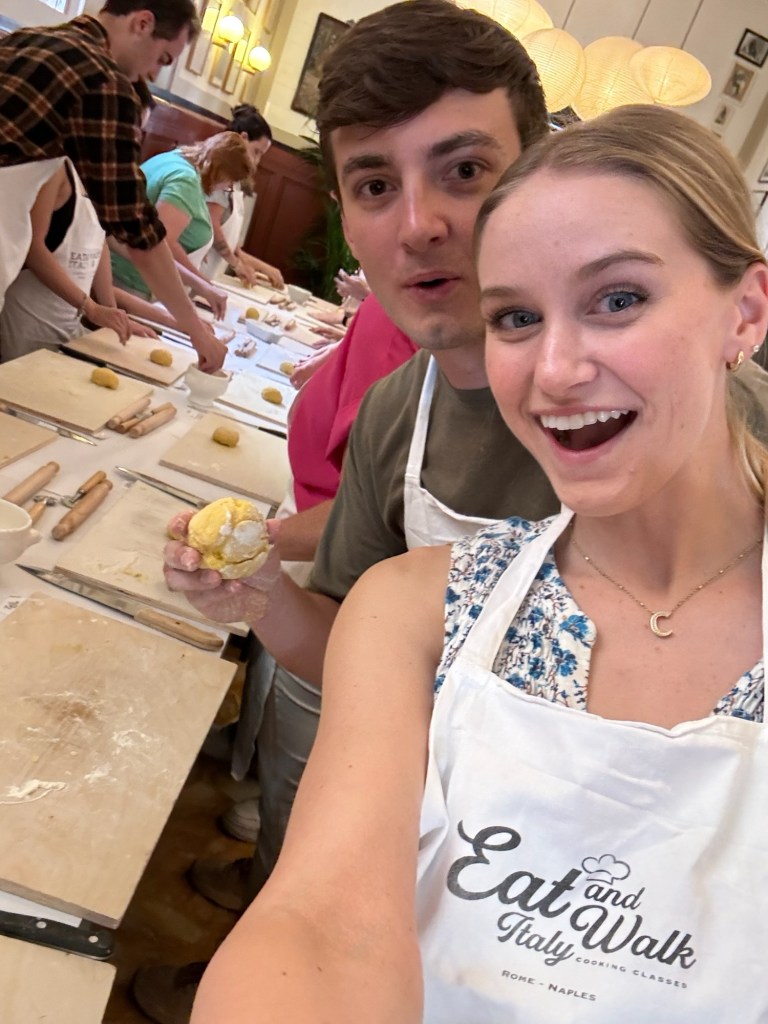 The next morning we woke up early for a jam-packed day! Hoping to get there before it got too crowded, we walked to Trevi fountain, hiked up the Spanish steps, got breakfast, and went to the Borgese museum and garden. We did a self-guided tour to keep things at our own pace. I noticed there were Greek and Egyptian influences in some of the artwork. Realizing how hungry we were, we walked back towards our hotel, getting lunch at Pasta Urbana; we both ordered the gnocchi and enjoyed every bite. Andrew and I decided to relax before our pasta-making class where we learned how to make fettuccine, ravioli, and tiramisu. Our instructor was fantastic, learning and laughing the whole time, this became one of our favorite memories in Rome. We explored the Piazza Novella, ending our night by drinking a beer at the world-famous, award-winning Scholars Lounge Irish Pub.