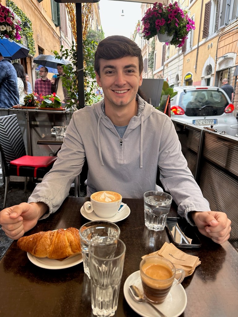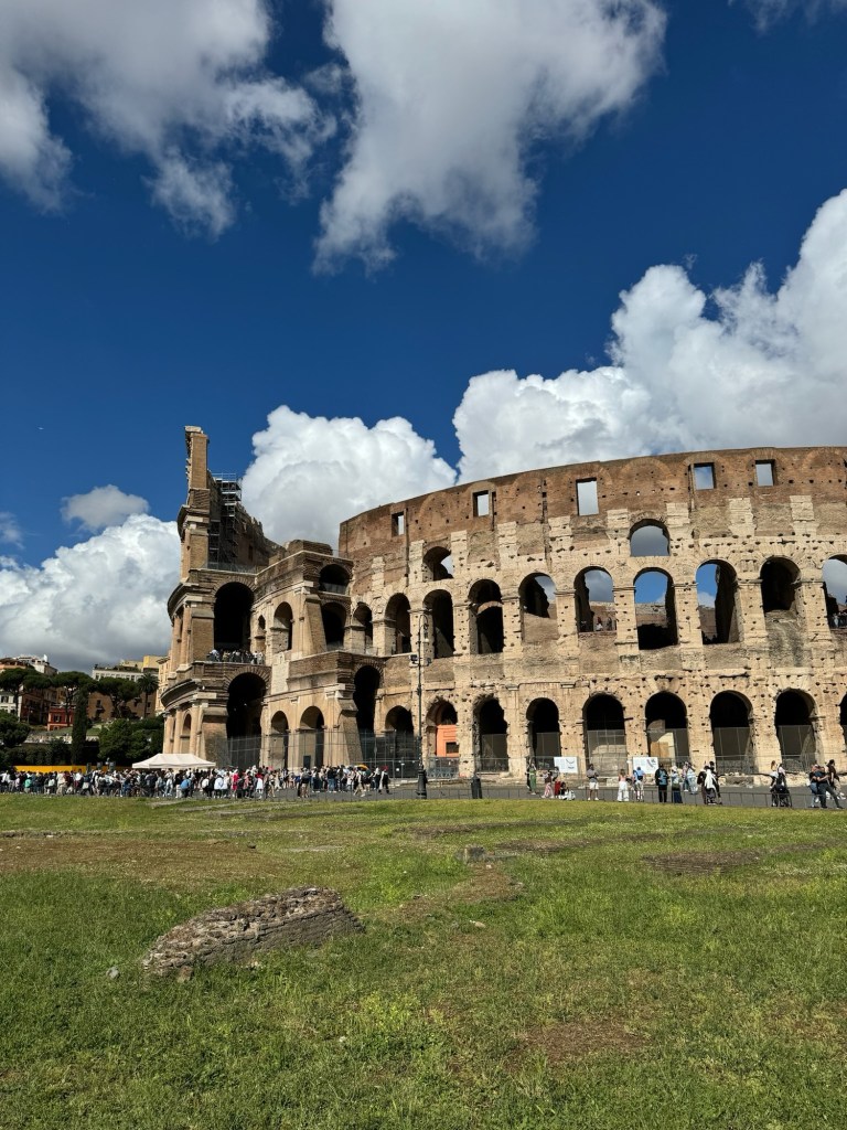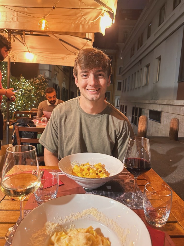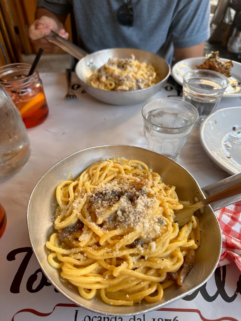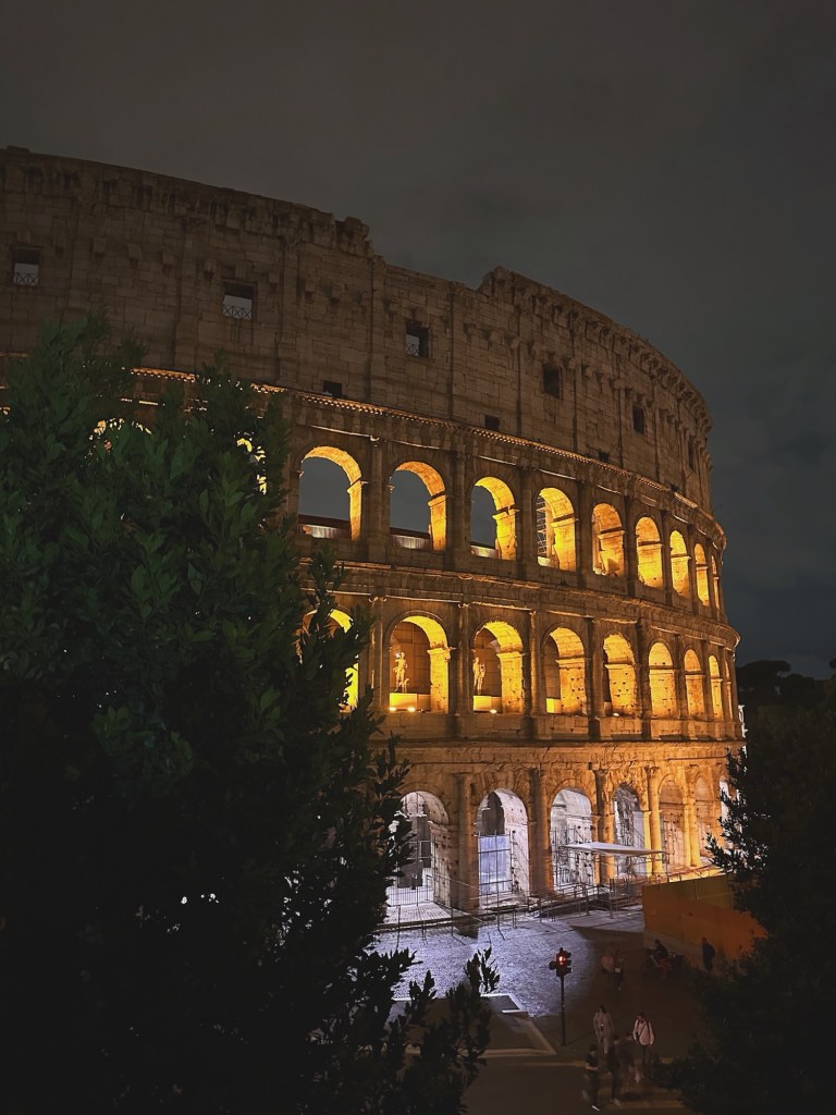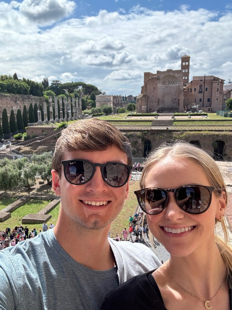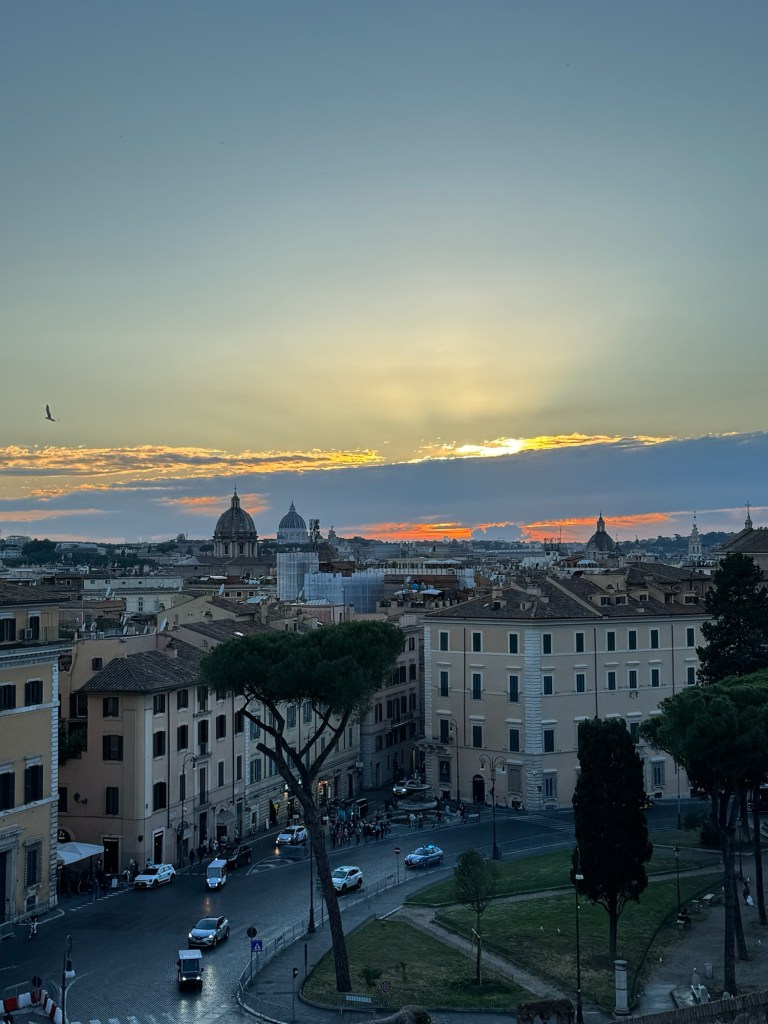 Our last day was rainy, yet it was one of my favorites. We had a fabulous breakfast at Er Baretto before we toured the Colosseum. Walking the ancient fighting grounds, it was fascinating to learn that the center of the Colosseum used to be filled with water and crowds would watch ships battle. We explored the Roman Forum and Palatine Hill as quickly as we could before they closed. We had dinner at Tonnorello, where we met a wonderful couple from London, the four of us shared the differences between our countries and the exciting plans we all had during our time here in Italy. Both of us ordered the fried artichoke, carbonara, and an Aperol Spritz. As Andrew and I walked the streets of Rome one last time, we passed by more live music and watched the sunset from a view.